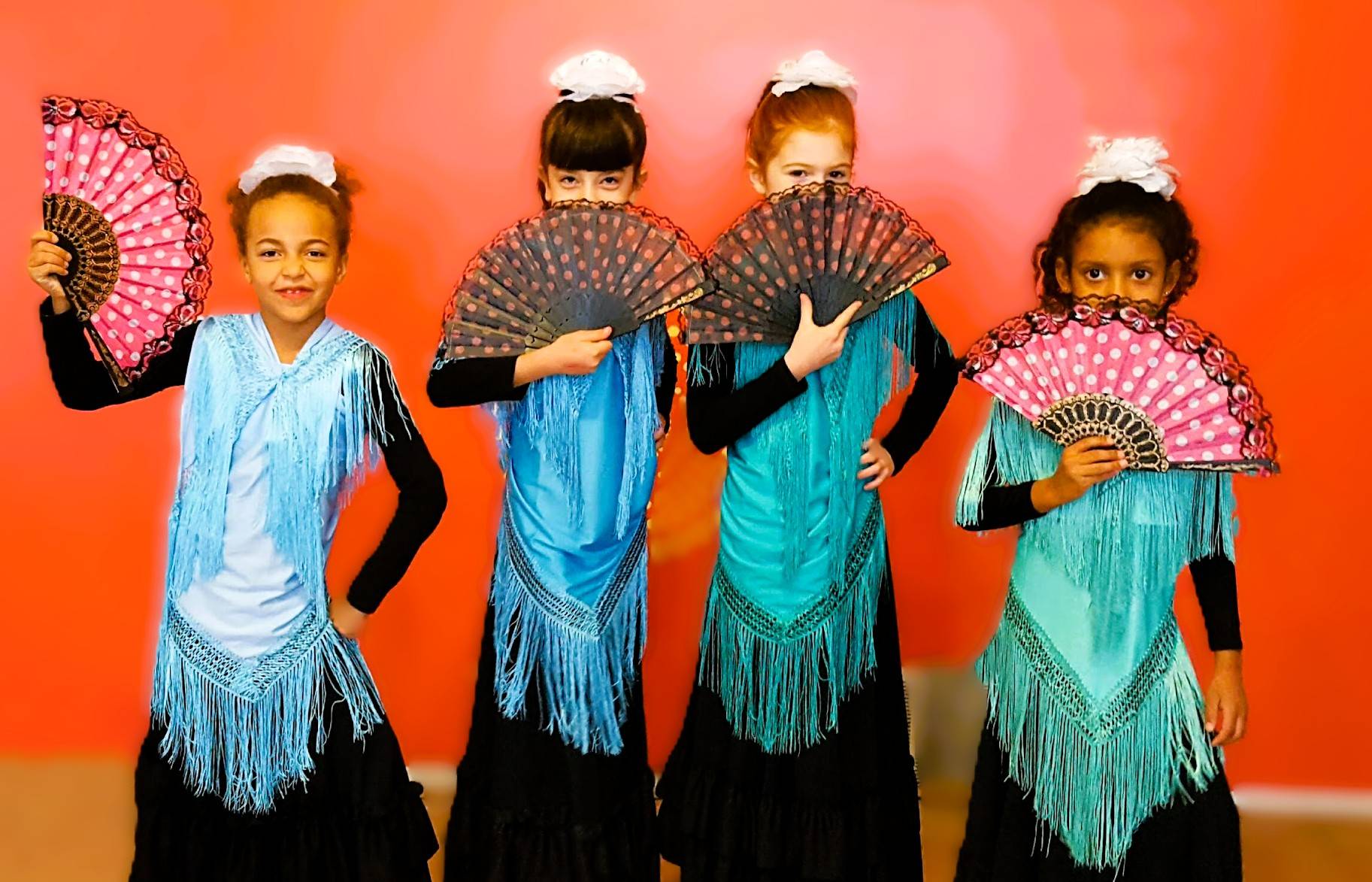 Teacher Mickey's young flamenco students radiate confidence and rhythm—exploring fan work, posture, and expression in a fun, beginner-friendly flamenco class.